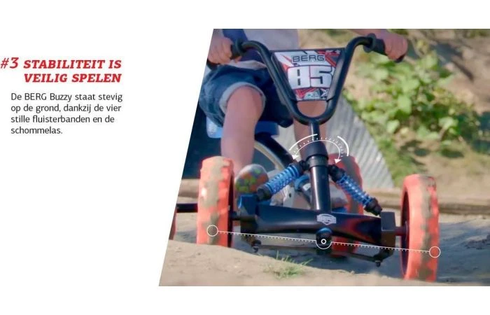 Dankzij de 4 wielen heeft de BERG Buzzy een uitstekende stabiliteit. Omdat de driewielers een wiel minder hebben, zijn deze veel minder stabiel. Het zwaartepunt ligt hierdoor dicht bij de kantellijn, de lijn tussen het voorste en achterste wiel. Scherp of snel door een bocht rijden kan bij een driewieler makkelijk leiden tot het omvallen van de driewieler en passagier. Doordat de Buzzy 4 wielen heeft ligt de kantellijn veel veder naar buiten en verder af van het zwaartepunt. Dit maakt het omvallen van de Buzzy bijna onmogelijk waardoor deze aanzienlijk veiliger is.