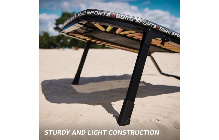 Als je ‘m hebt uitgeklapt staat ‘ie altijd stevig op de anti slip voetjes. Of je hem nu gebruikt in het park of toch in de duinen.