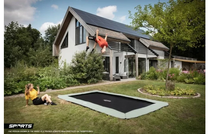 Een FlatGround trampoline gaat perfect op in je tuin. FlatGround betekent namelijk dat de trampoline op gelijke hoogte is als je tuin. Je kunt ook kiezen uit een Regular versie van de ECO. Deze uitvoering is een trampoline op poten.